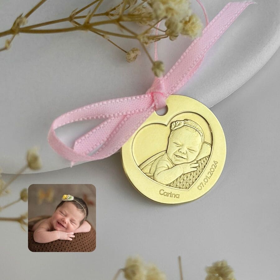 Baby-Münze mit Foto und Herzausschnitt, 30 mm (925 Silber)