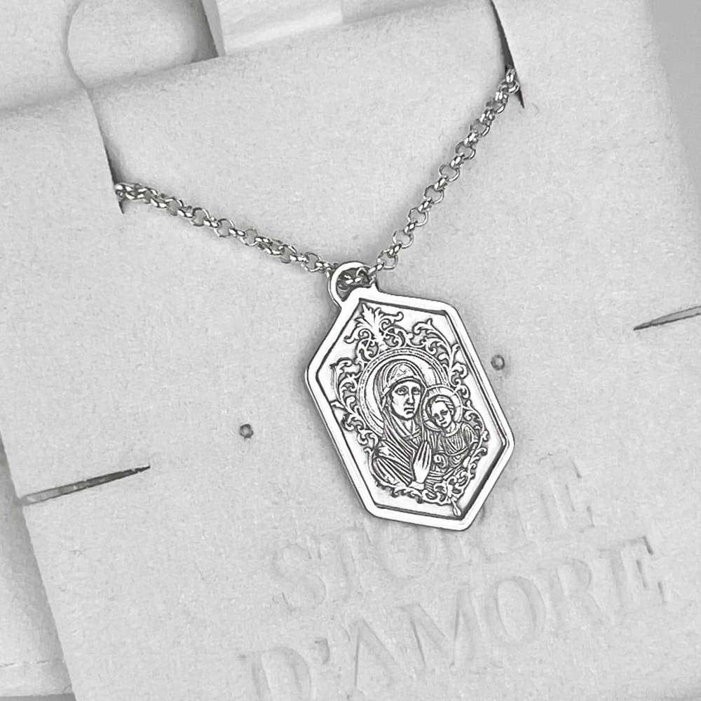 Sechseck-Anhänger mit Jungfrau Maria und Kind, 925 Silber