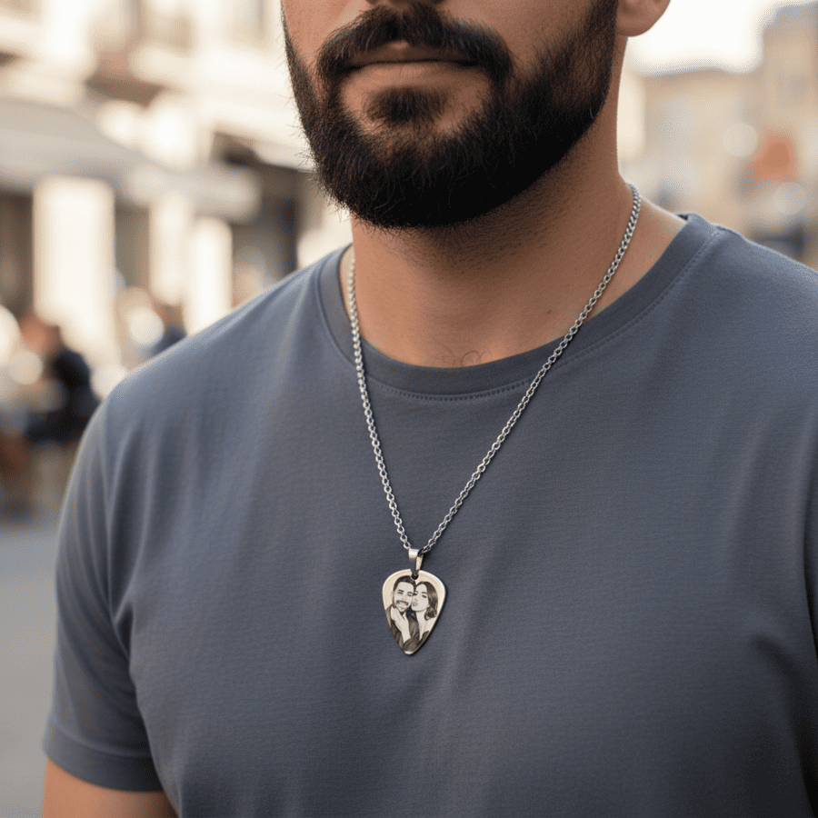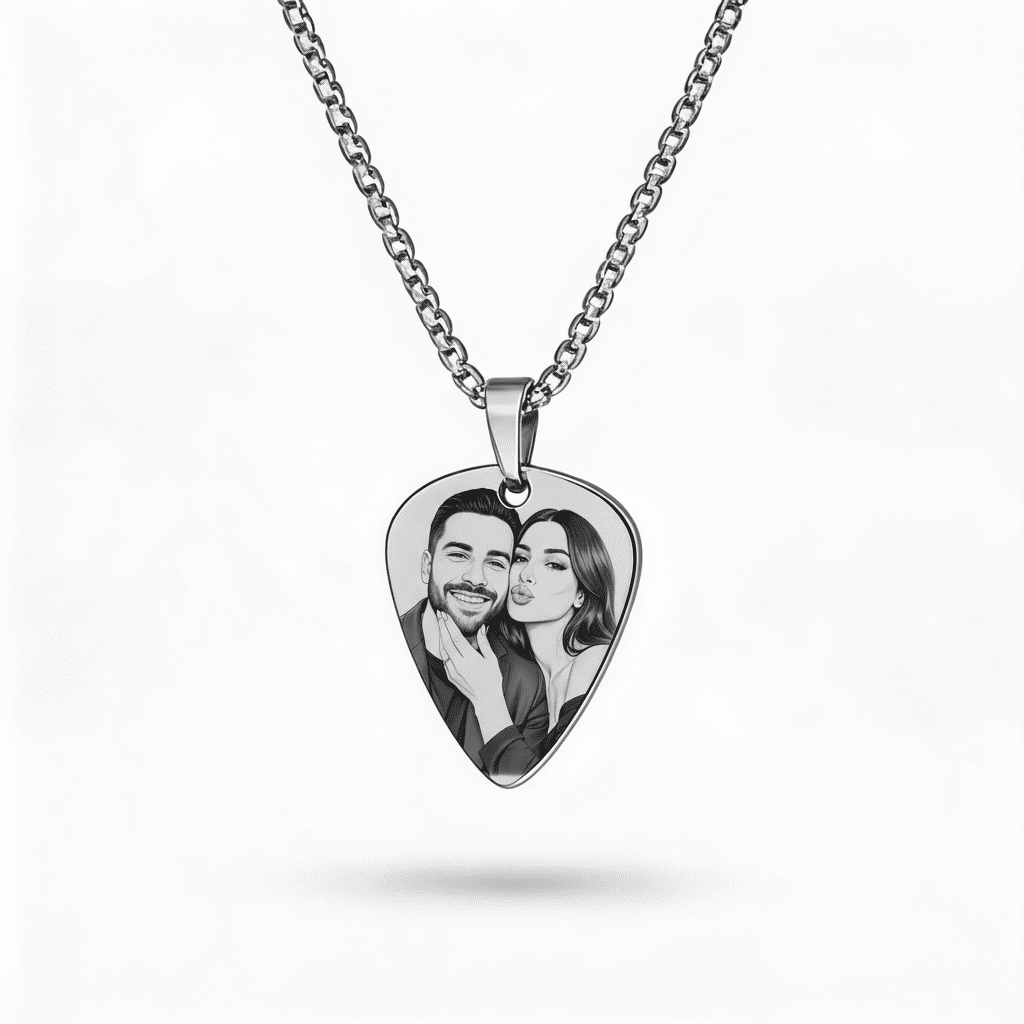 Un pandantiv elegant din argint, în formă de pană de chitară – o bijuterie subtilă și plină de semnificație, pe care o poți purta zi de zi. Fotografia ta preferată este transformată într-o gravură clară și detaliată, iar un colier simplu devine o amintire puternică a celor pe care îi iubești cel mai mult.